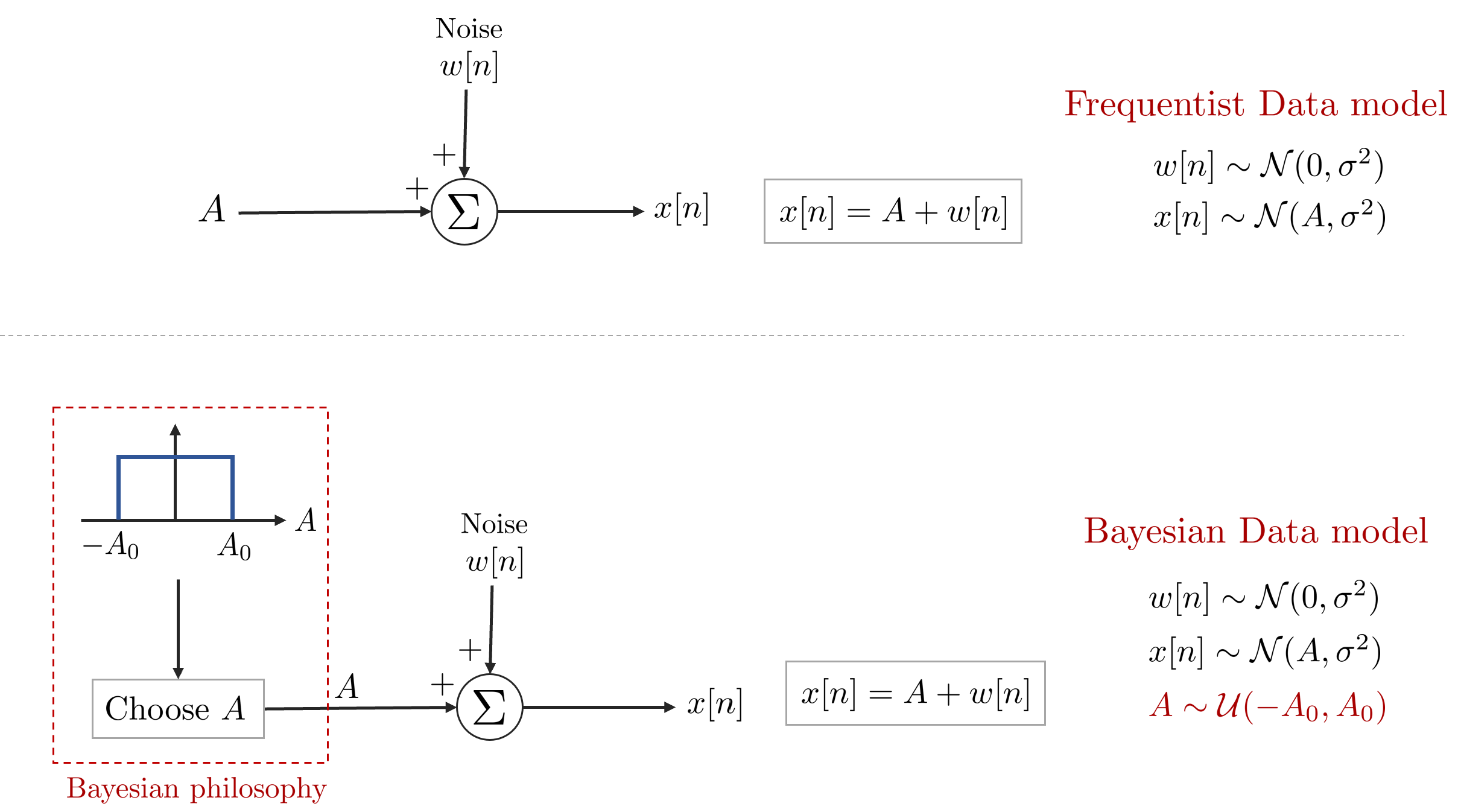 & \text{Bayesian: } \quad \underbrace{x[n]}_{\text{r.v.}} = \underbrace{\theta}_{\text{r.v.}} + w[n] \\
