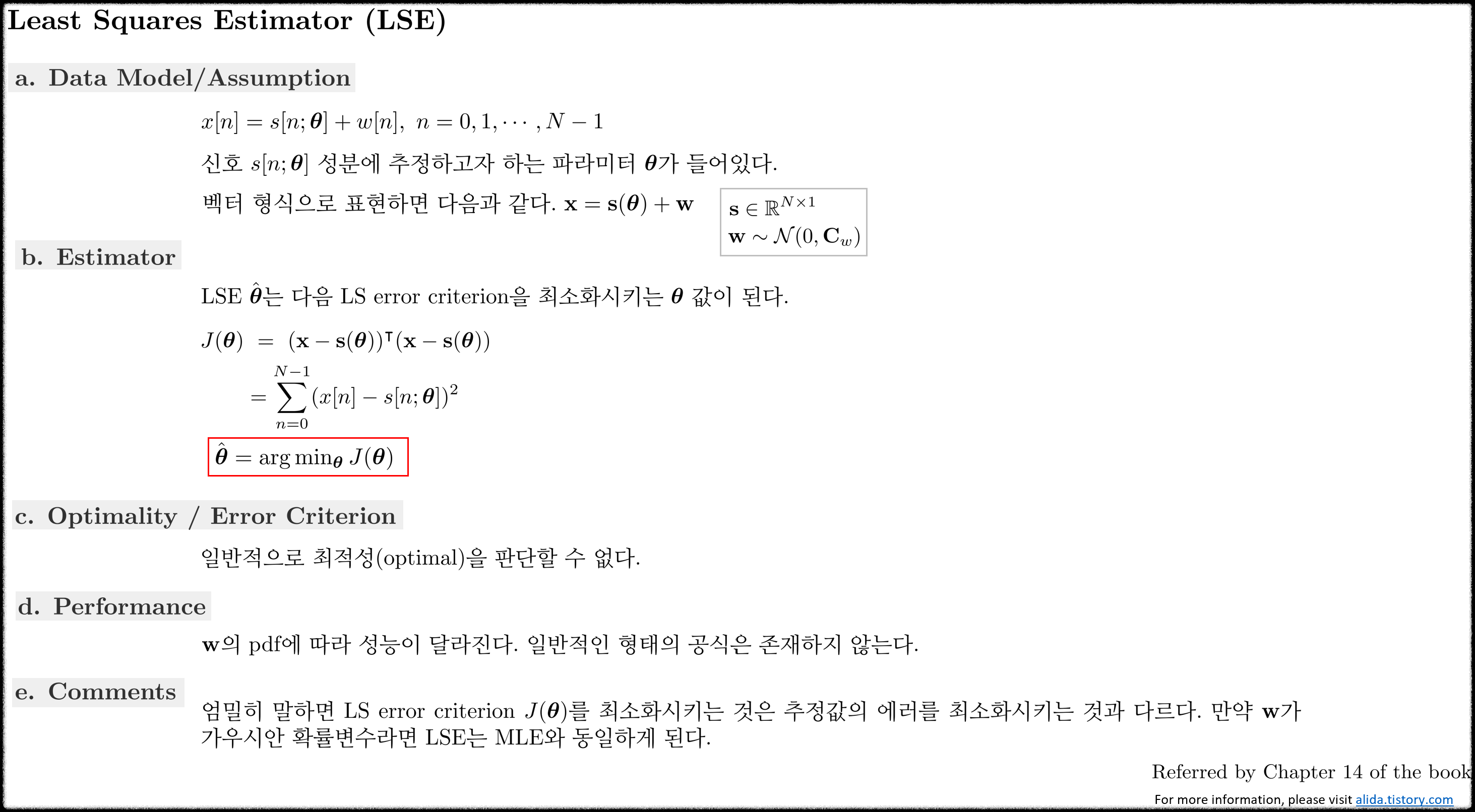 - Filtering : 필터링은 데이터 모델이 $x[m]=s[m]+w[m]$일 때 추정하고자 하는 파라미터가 $\theta=s[n]$인 경우를 말한다. $s[n]$은 신호를 의미하며 $w[n]$은 노이즈를 의미한다. 최적의 파라미터를 추정함으로써 우리는 신호에서 노이즈를 필터링하고자 한다. 필터링에서는 파라미터가 현재와 과거 데이터에만 의존하는 것에 유의하자.}