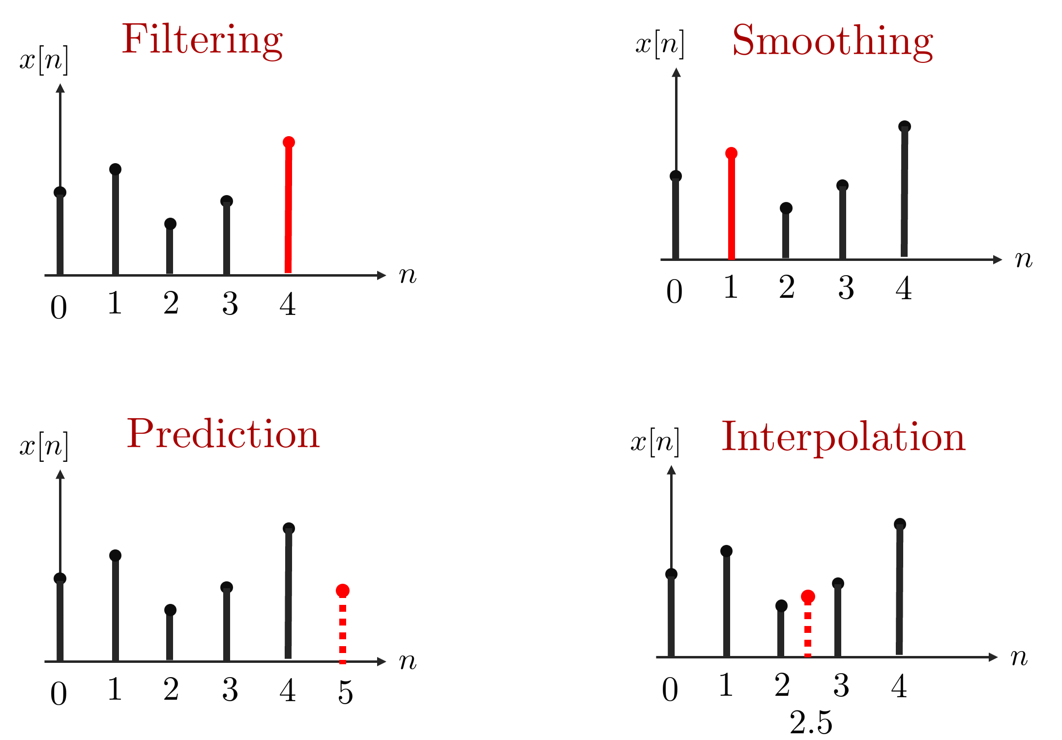- Interpolation: 보간은 관측 데이터 $\{x[0], \cdots ,x[n-1], x[n+1,\cdots,x[N-1]\}$이 주어졌을 떄 $\theta=x[n]$을 추정하는 경우를 말한다.