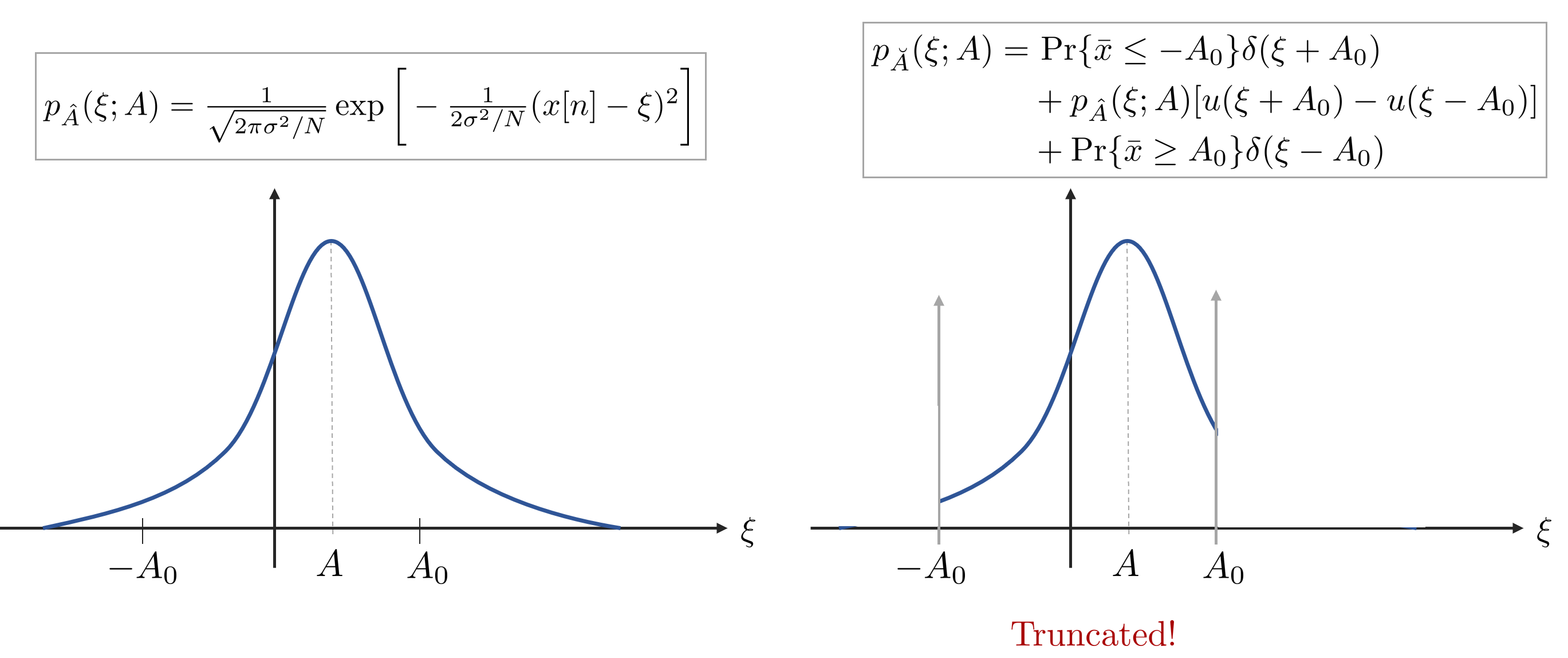만약 파라미터에 대한 사전 지식(prior knowledge)이 주어졌다면 이는 더 정확한 추정값을 찾는데 활용할 수 있다. Example 3.1에서 파라미터 $A$에 대한 MVUE는 $\bar{x}$라고 하였다. 하지만 이는 파라미터 $A$ 를 $-\infty < A < \infty$에서 얻은 경우에 대해서만 참이다. 만약 $A$를 제한된 영역인 $-A_0 \leq A \leq A_0$에서 얻었다고 가정해보자. 이렇게 되면 정해진 영역 밖에서는 $\hat{A} = \bar{x}$로 보는 것이 부적절할 수 있다. 다음과 같은 잘린 영역의(truncated) 추정값을 사용하면 추정값의 성능을 향상시킬 수 있다.