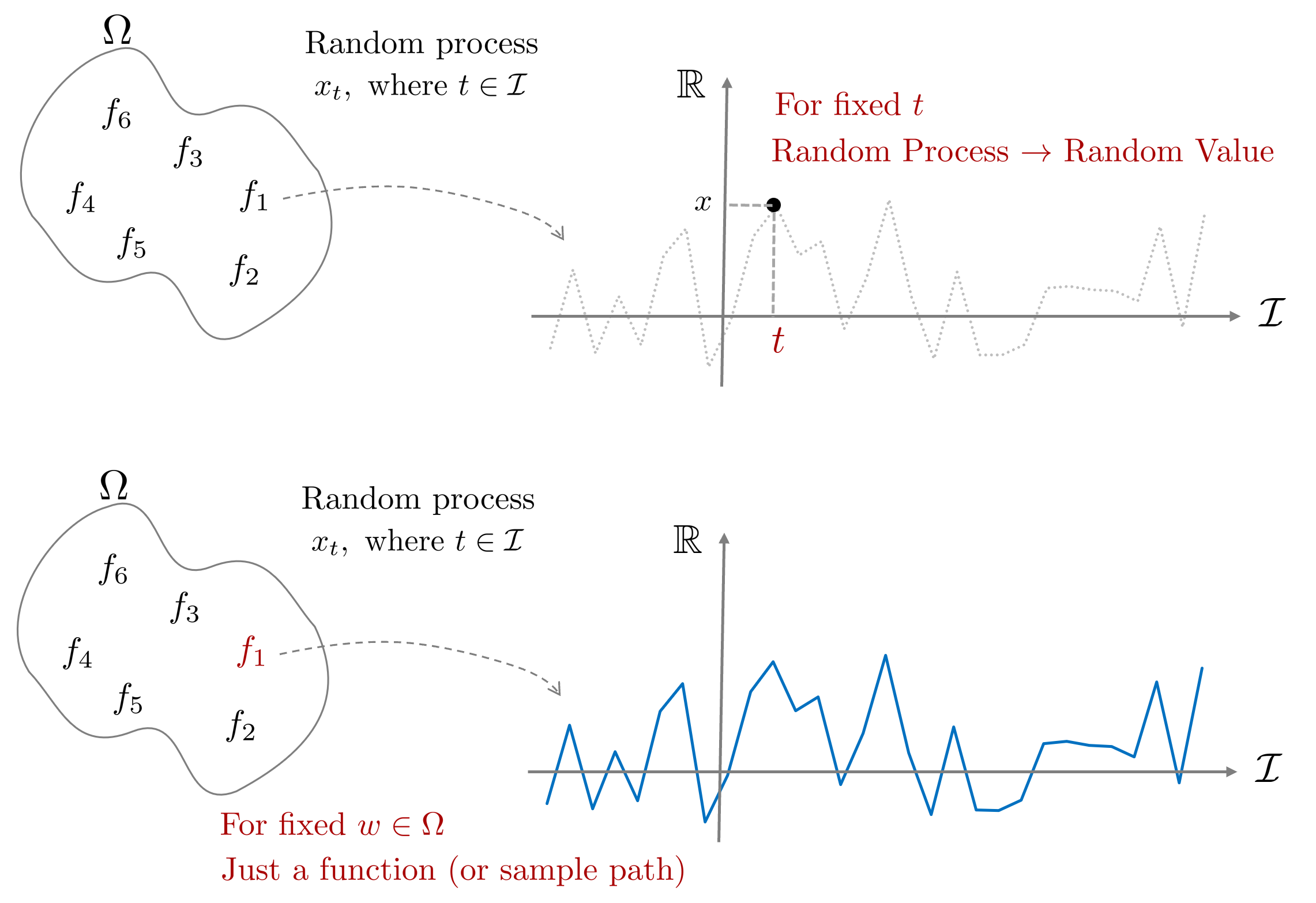 표본집합 $\Omega$에만 무작위성(randomness)가 존재하고 인덱스 집합 $\mathcal{I}$은 존재하지 않기 때문에 인덱스 집합 $t \in \mathcal{I}$을 고정시킨다면 랜덤프로세스 $x_t(w)$는 확률변수가 된다. 반대로 표본공간 내 원소 $w \in \Omega$를 실현(realization)한다면 확률변수 $x(w)$는 하나의 실수값이 나오지만 랜덤프로세스 $x_t(w)$는 하나의 함수(function 또는 sample path)가 나오게 된다.