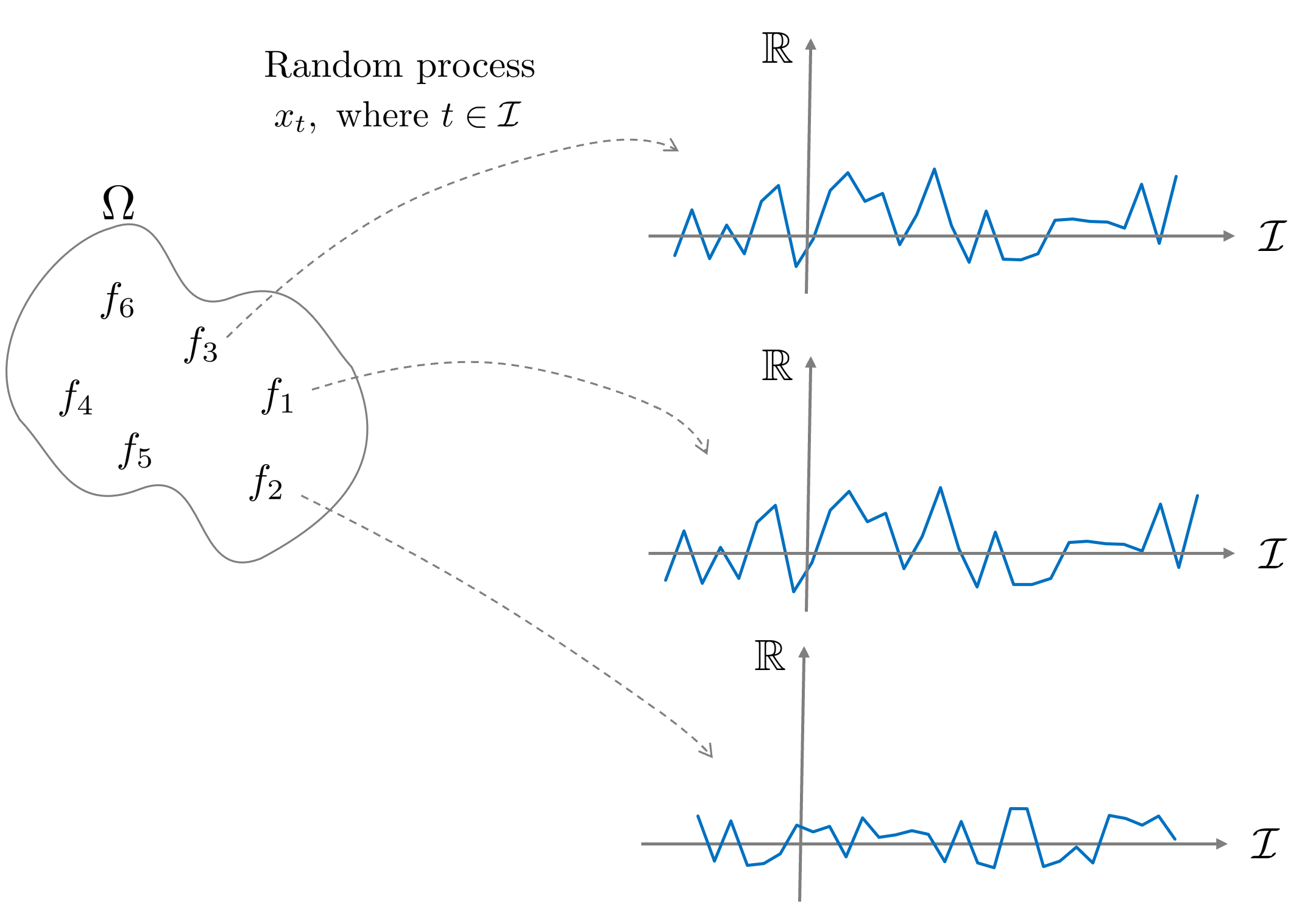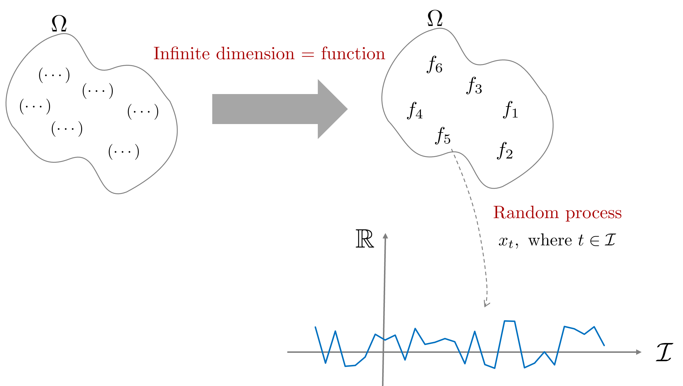 따라서 랜덤프로세스는 표본공간 $\Omega$에서 랜덤한 함수 하나를 추출하는 과정으로 해석될 수 있으며 여기에서 인덱스 집합 $\mathcal{I}$를 사용하여 추가적인 차원 (일반적으로 시간 $t$)을 더해줌으로써 $\Omega \times \mathcal{I}$ 공간에서 원소를 추출하게 된다.