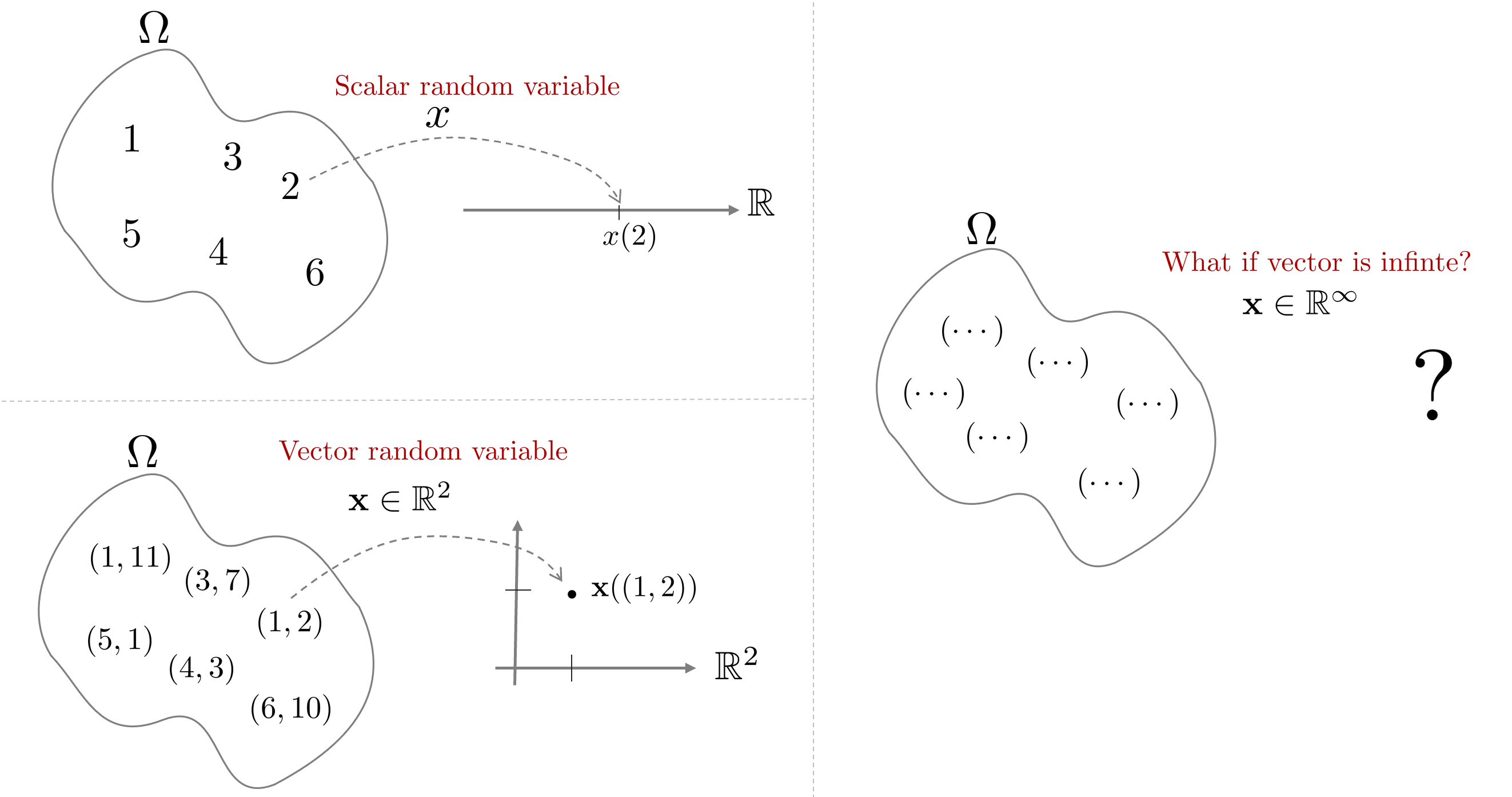 $n \rightarrow \infty$가 된다면 벡터 확률변수 $\mathbf{x}$는 표본공간 $\Omega$에서 $\infty$개의 표본을 $\infty$개의 실수 벡터로 변환하는 연산자가 될 것이다. 이는 표본공간 $\Omega$에서 하나의 함수를 변환하는 연산자로 볼 수 있을 것이다. 함수해석학적으로 봤을 때 함수 $y=f(x)$는 $x$를 넣으면 $y$가 나오는 무한차원의 벡터로 해석할 수 있다. 예를 들어, 입출력이 실수라면 $x$도 무한개 $y$도 무한개인 벡터가 된다.